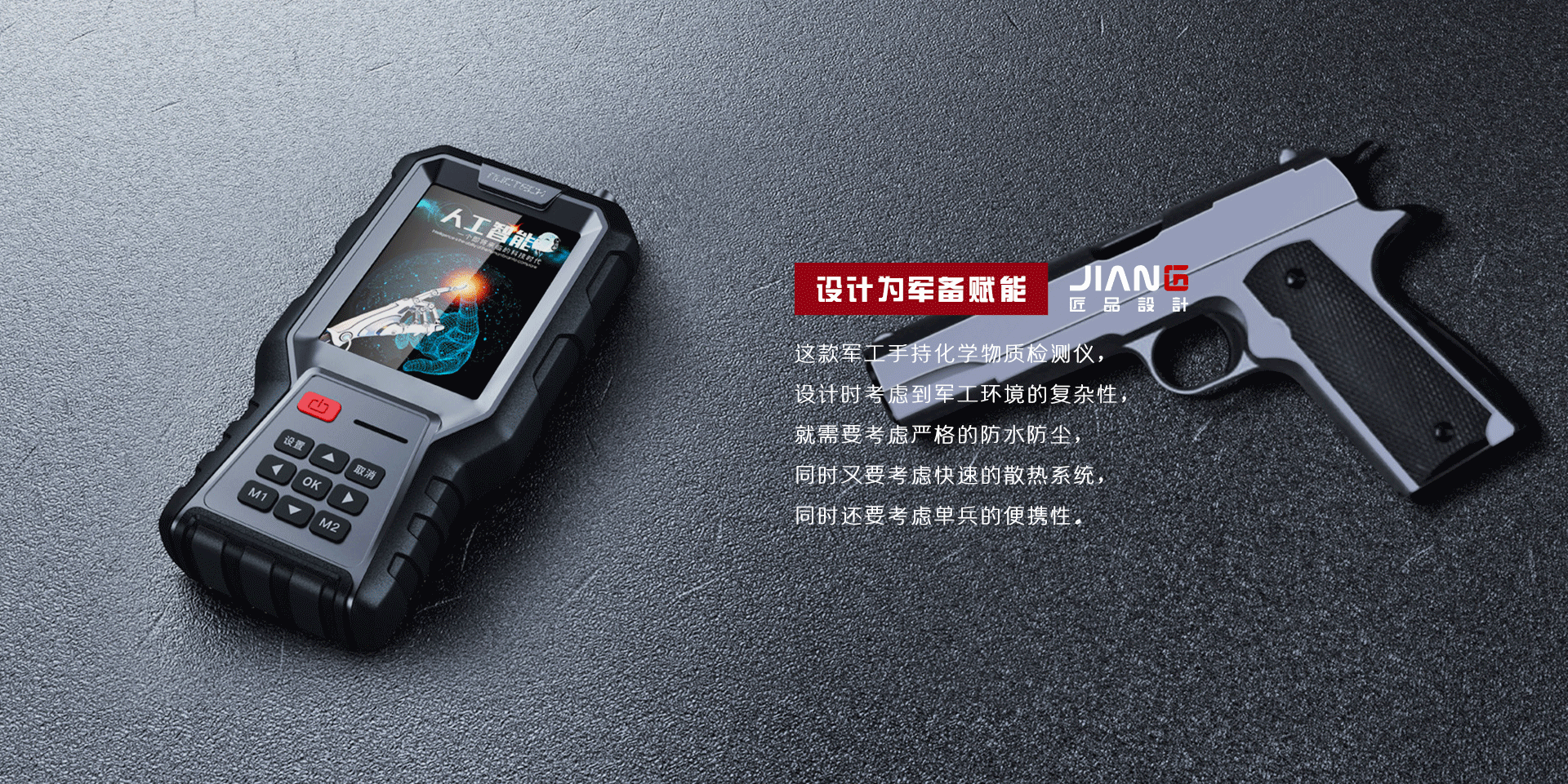 匠品設計--這款軍工手持化學物質檢測儀,設計時考慮到軍工環境的復雜性,就需要考慮嚴格的防水防塵,同時又要考慮快速的散熱系統,同時還要考慮單兵的便攜性。
