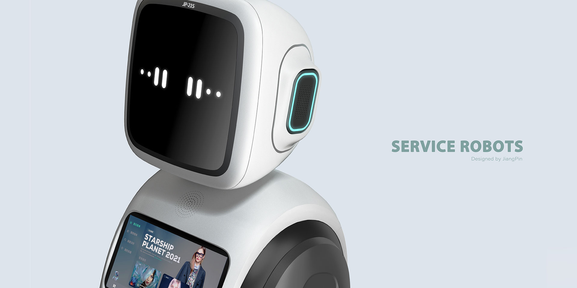 智能服務機器人設計,整體造型簡約大氣,這款機器人可以通過大屏的表情與人類進行簡易的交互,擺脫機械的冷漠感。胸口的觸摸屏可提供需要的服務信息,是未來智能家居的好助手。