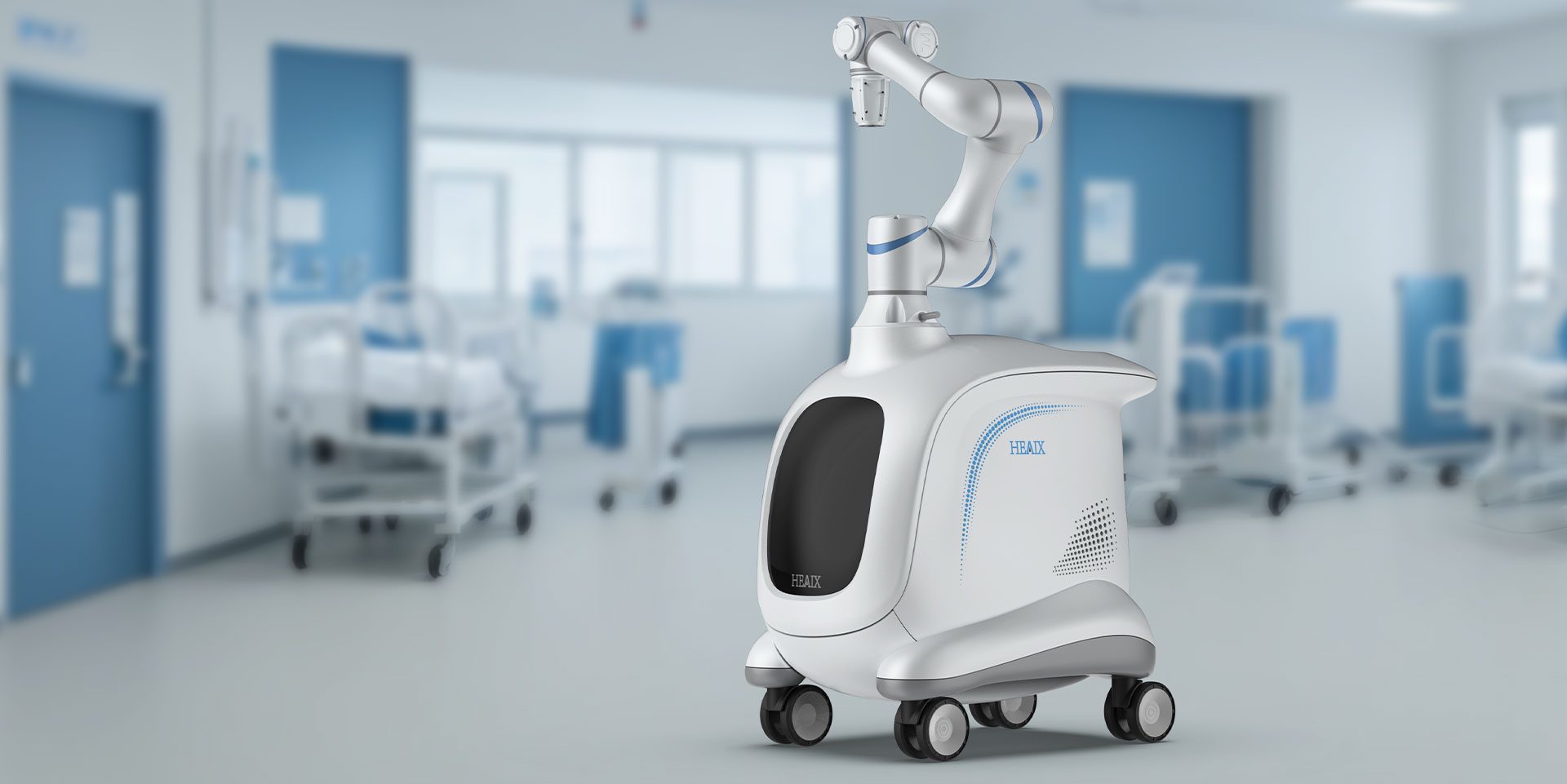 這款骨科手術機器人整體設計簡潔大方,線條流暢,彰顯科技感與專業感。機身主體采用純凈的白色,這一經典的醫療色彩,不僅傳遞出潔凈、安全的理念,也與醫院的整體環境相適配,給患者帶來心理上的舒適與安心。在白色基調之上,點綴以藍色線條,藍色象征著冷靜與智慧,為機器人增添了一份靈動與科技氛圍。